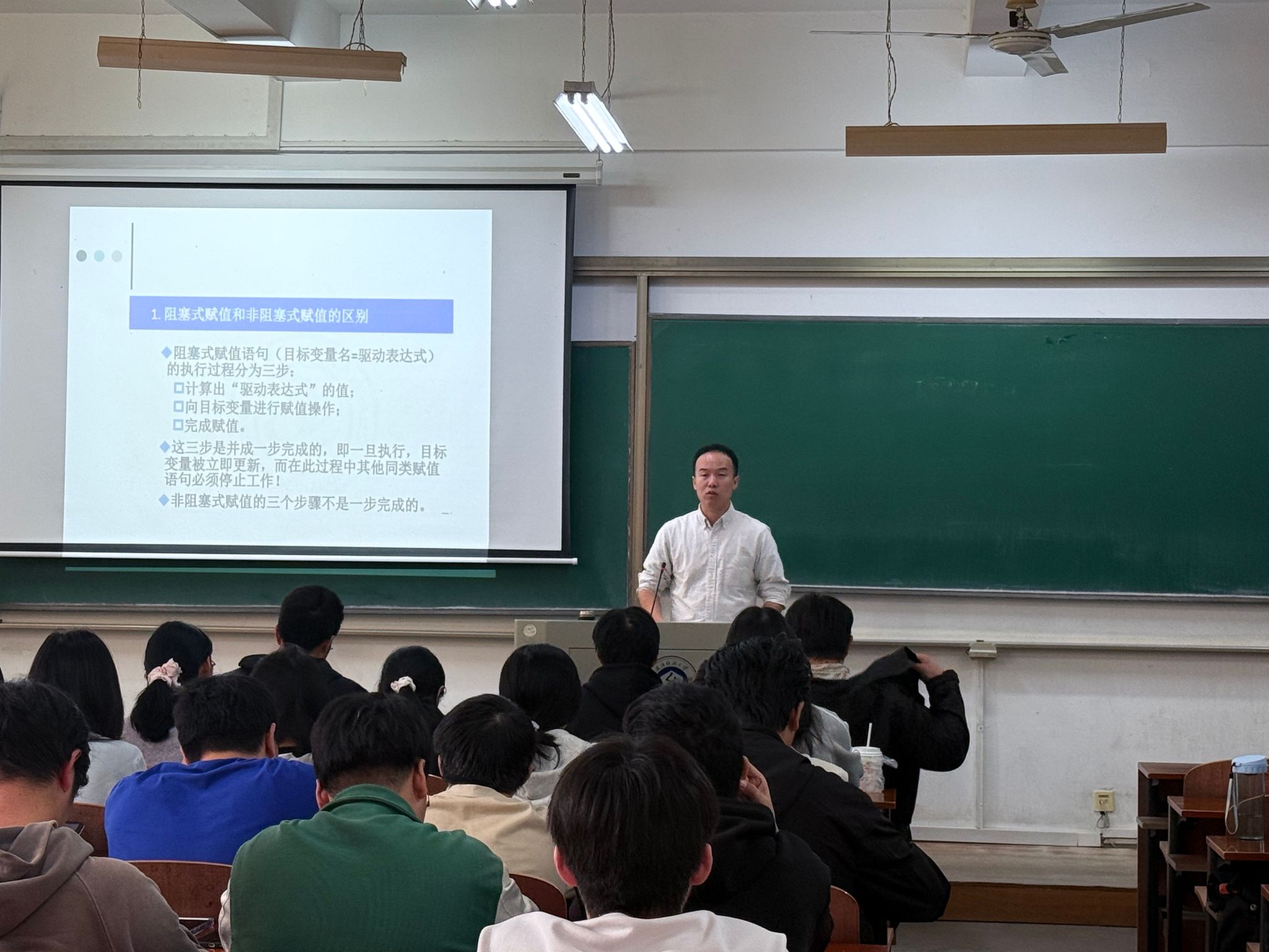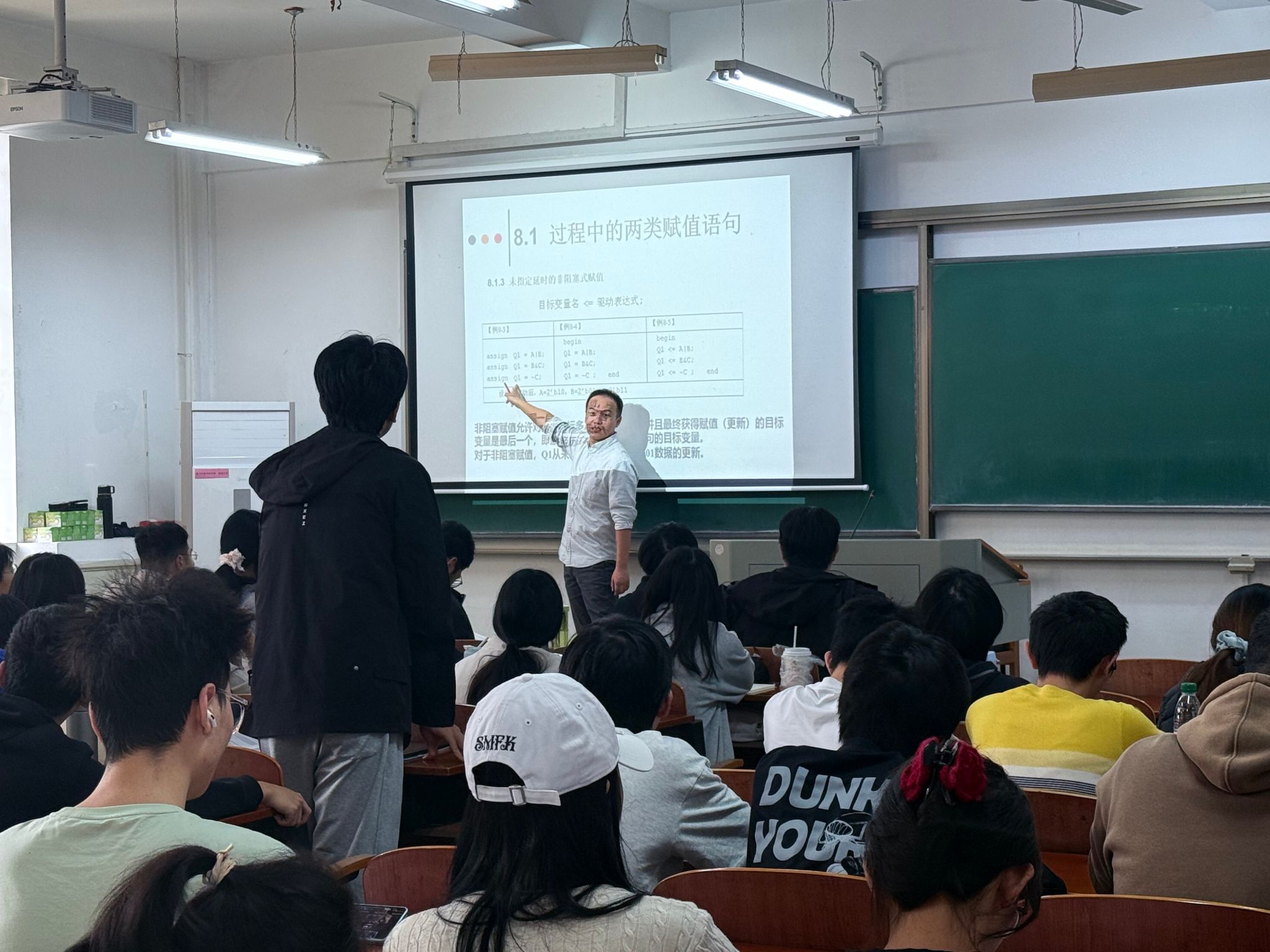 本次课主要围绕verilog程序语言设计展开讲解,郭老师善用对比归纳,帮助学生构建完整清晰的知识体系。在讲解过程语句时,郭老师并未孤立地介绍语法,而是将其与之前学过的连续赋值语句进行对比,使学生清晰地认识到过程语句是描述时序逻辑和复杂组合逻辑的核心,从而在宏观上构建起HDL描述方法的知识框架,有效避免了概念的混淆。
