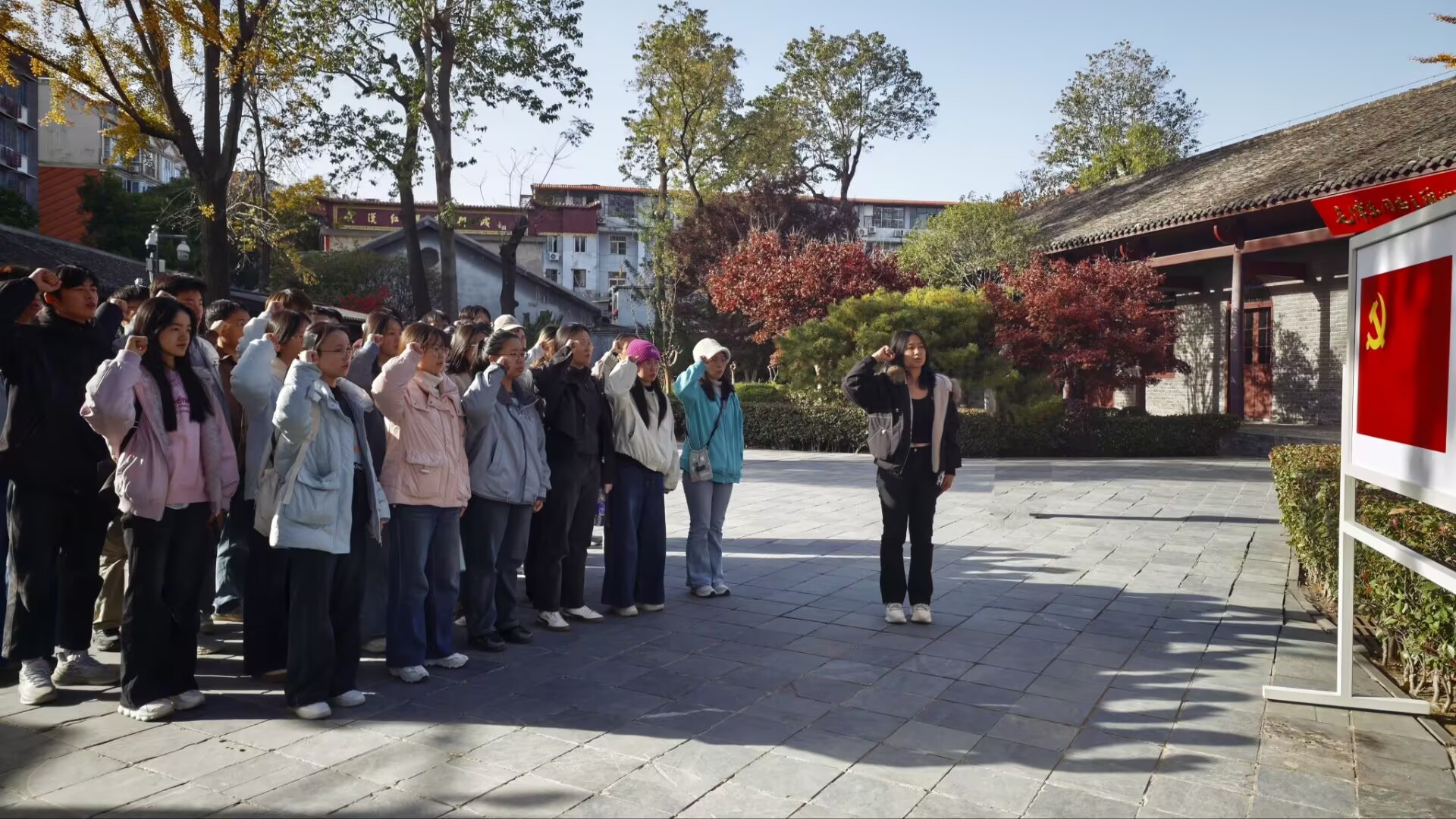 “我志愿加入中国共产党,拥护党的纲领,遵守党的章程……”在农讲所旧址门前,同学们举起右拳面对党旗进行入党宣誓,庄严肃穆的神情、铿锵有力的字句,无不透露出坚定的决心和信念。